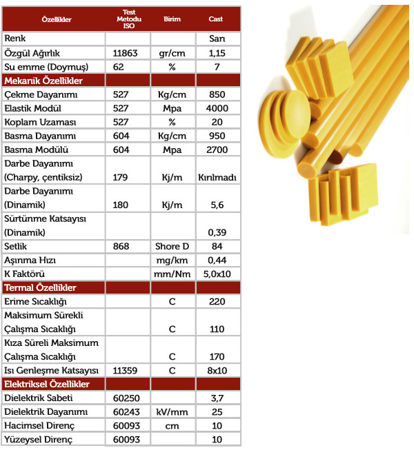DÖKÜM POLYAMİD (CAST) bilinen mekanik ve fiziksel özelliklerini daha da arttırmak amacı ile özel katkılı tipleri de iöal edilmektedir.