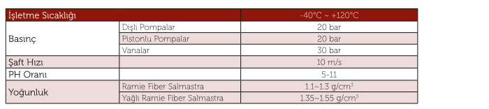 PTFE ile emprenye edilmiş yüksek kaliteli ramie fiberlerden örülmüştür. Salmastra daha sonra yeniden özel bir PTFE dispersiyon ile iyice emprenye edilir. Çalıştığı ortamı lekelemez, şaft ve millere zarar vermez.