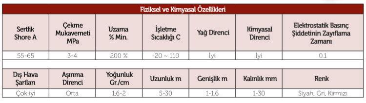 Yüksek yalıtım özelliği kazandırmak için özel olarak NBR/SBR/NR'den üretilmiştir. Hızlı elektrik şarj boşaltma özelliğine sahiptir.