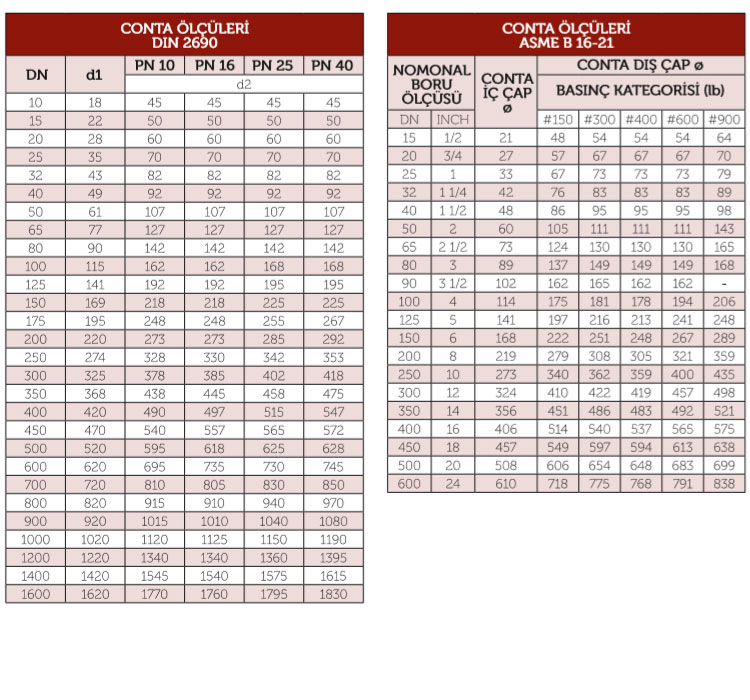 Kendi üretim tesislerimizde uluslararası standartlara uygun vana ve flanş contaları üretilmektedir. Kataloğumuzda tanıtılan malmul conta malzemelerinden standart ölçülerde (15- 1000 mm) ve daha büyük standart dışı özel löçülerde conta imalatı mümkündür.